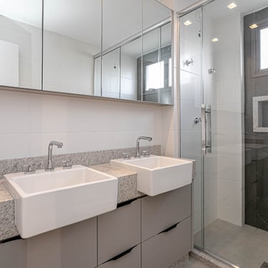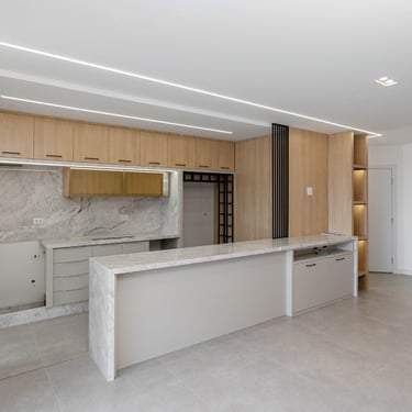 Cozinha planejada com pedra Branco Paraná, funcional e moderna